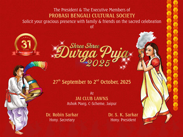We are pleased to announce that PBCS is celebrating 30th Year Celebration of Durga Puja this year from 8th to 13th October 2024. Puja being held at Jai Club Lawns, Ashok Marg, C-Scheme, Jaipur.